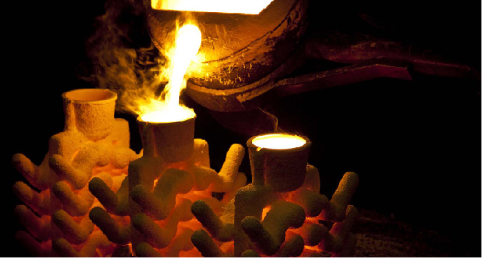 The ceramic mold is heated to around 800-900°C. The heating process further strengths the mold, eliminates any leftover wax or contaminants, and evaporates water from the mold material. Molten metal is poured into the mold while it is still hot – liquid metal flows into the pouring cup, through the central gating system, and into each mold cavity on the tree. The pre-heated mold allows the metal to flow easily through thin, detailed sections. It also creates a casting with improved dimensional accuracy, as the mold and casting will cool and shrink together.